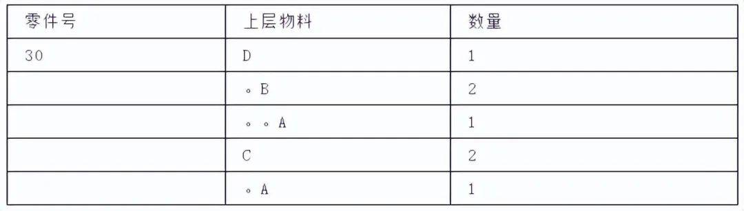 缩行跟踪的格式指出了某零件在所有高层物料中的使用情况。它可查找直接或间接地使用某零件的所有高层物料,采用这种格式很有价值。现以下表表示: