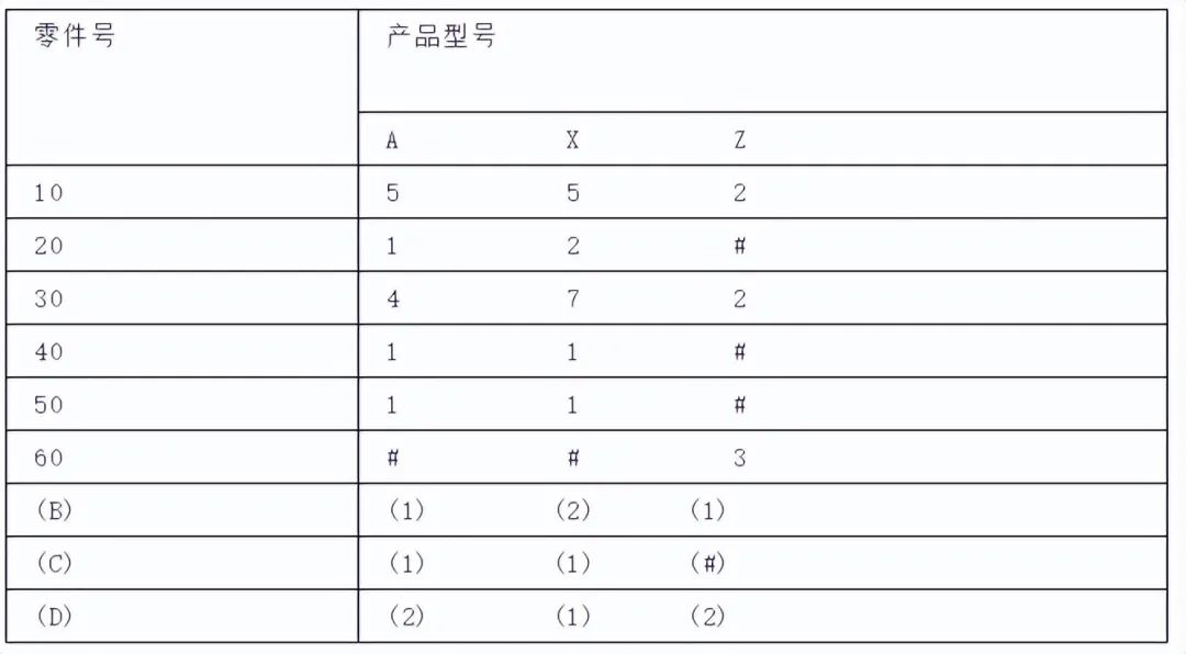 矩阵式的BOM是对具有大量通用零件的产品系列进行数据合并后得到的一种BOM。这种形式的BOM可用来识别和组合一个产品系列中的通用零件。在下面的输出格式中,左面列出的是各种通用零部件,右面的上部列出了各个最终产品,下面的数字表示装配一个最终产品所需该零件的数量。”#”表示该产品不用此零件。对于有许多通用零件的产品,这种形式的BOM很有用处。但矩阵式BOM没有规定产品制造的方式,它没有指出零件之间的装配层次,因此,不能用于指导多层结构产品的制造过程。