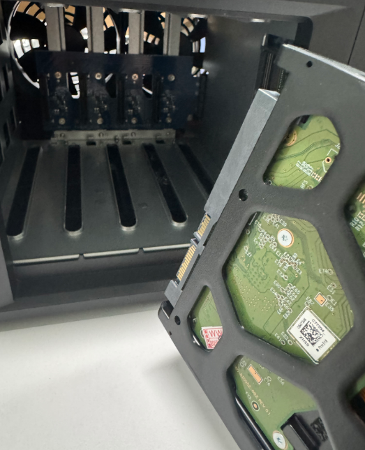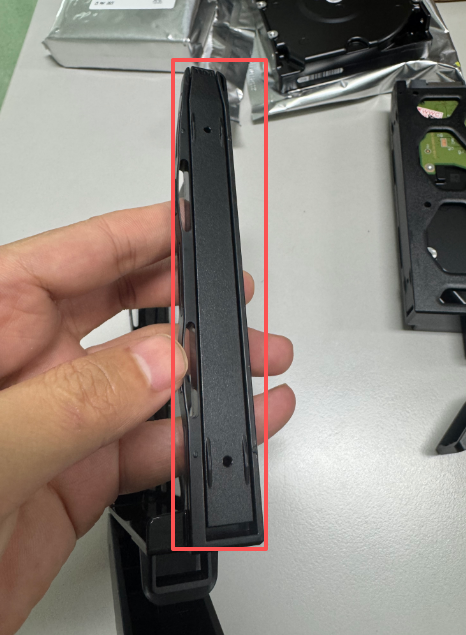 客户一个DS224+,外加4个8T WD企业硬盘。可以看到这是WD的企业硬盘,这个硬盘是泰国生产的,我觉得泰国的生产工艺不太行,虽说是全新未拆的,但是拆开后硬盘表面上还是有很多划痕。工艺的确不能和我们比。然后再把硬盘支架的卡条安装回去,固定好硬盘就可以了。这时要确定一下,硬盘如何安装到NAS服务器的硬盘架子中。我们要确定好,硬盘的接口位置。NAS中的硬盘接口在下面,所以我们安装硬盘,也需要将硬盘的接口位置往下安装进去,还需要确定一下,正反,如果反了,是不好直接插进去的。硬盘安装完成之后,我们就需要为这NAS安装操作系统了。首先我们需要到官方下载安装系统软件。