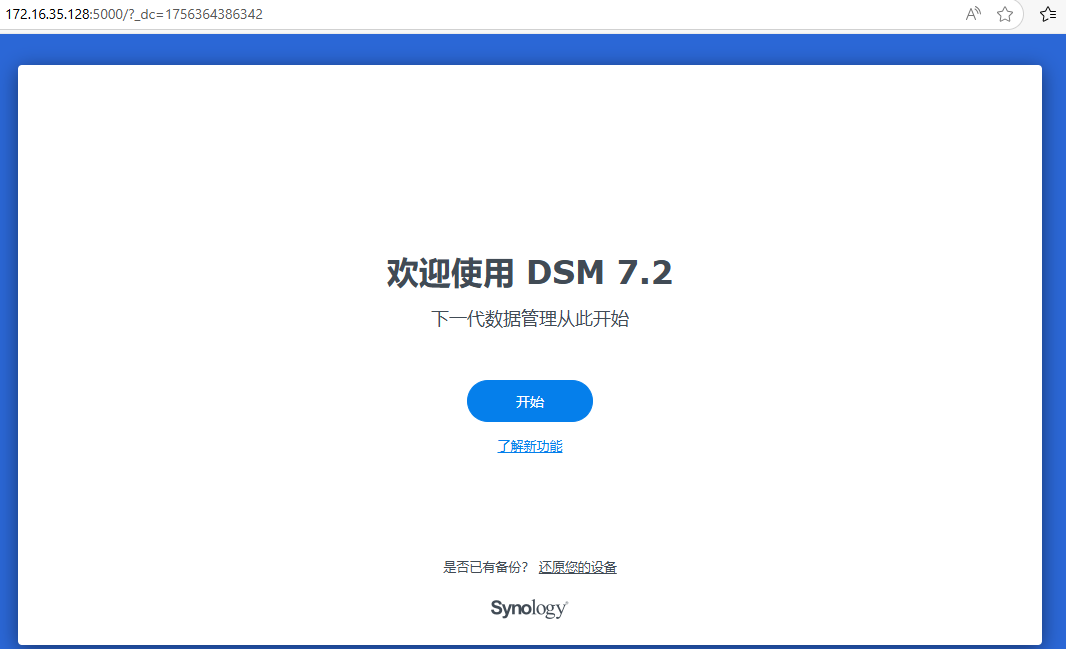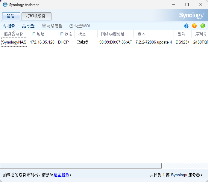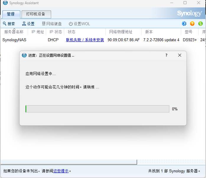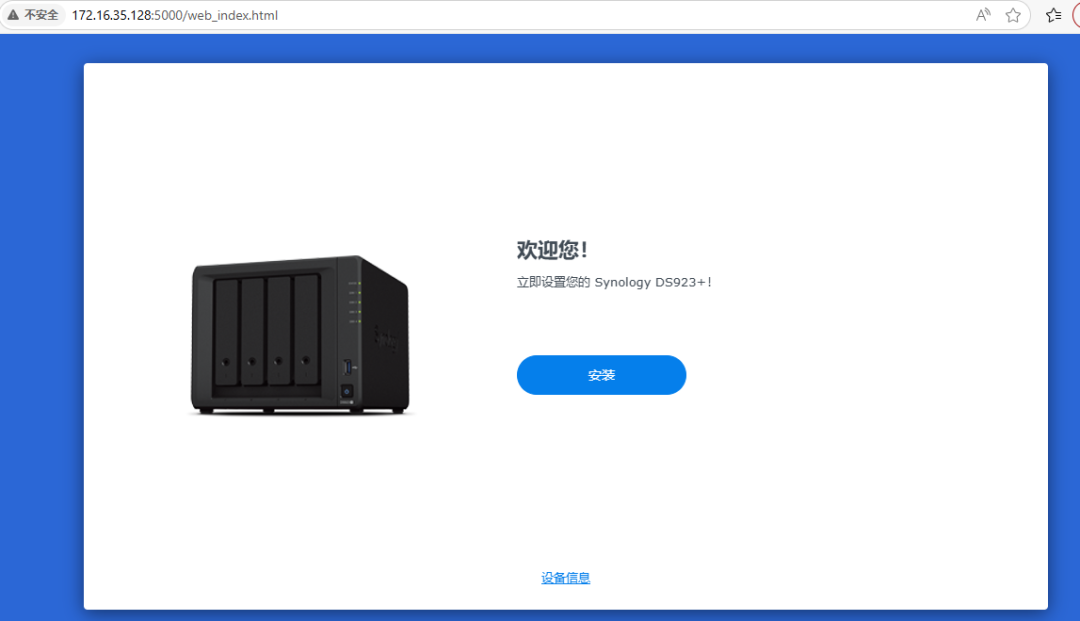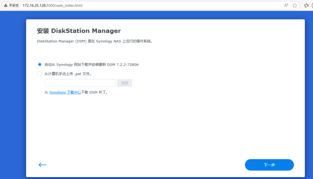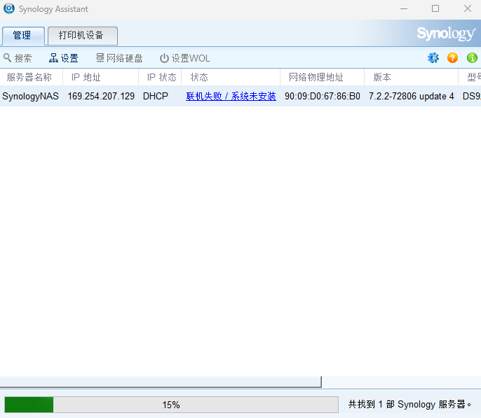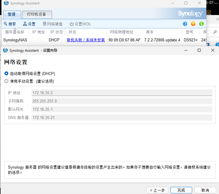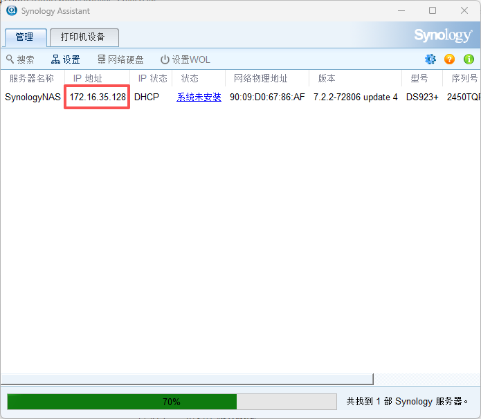 选择windows版本,因为我的电脑操作系统是windows版本。这时需要将NAS连接到公司网络中,最好在同一个局域网。如果不在同一个局域网,或者无法获取ip地址,就容易显示联机失败。将NAS服务器的网口连接到公司的网络中,通过自动获取IP地址。虽说现在NAS还没有操作系统,但是默认NAS的网卡,就是可以通过自动获取IP地址。这时,可以直接双击系统未安装,可以跳出来下面系统安装界面172.16.35.128,安装系统界面,这个系统,是可以通过web网络联网来安装操作系统的。选择从群辉网站上下载并安装最新版本的DNS7.2.2这个版本的操作系统。当出现下面的界面的时候,就说明NAS的操作系统,已经成功安装完成了。系统已经是确定安装完成了,那现在还需要对硬盘进行创建磁盘空间。这时就正在格式化,这个RAID5空间了。这个格式化需要好几个小时才能完成。这时系统和空间都已经格式化成功,这时就可以创建共享文件夹了。