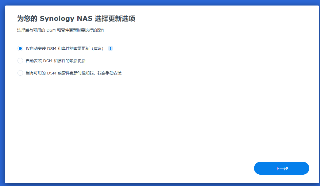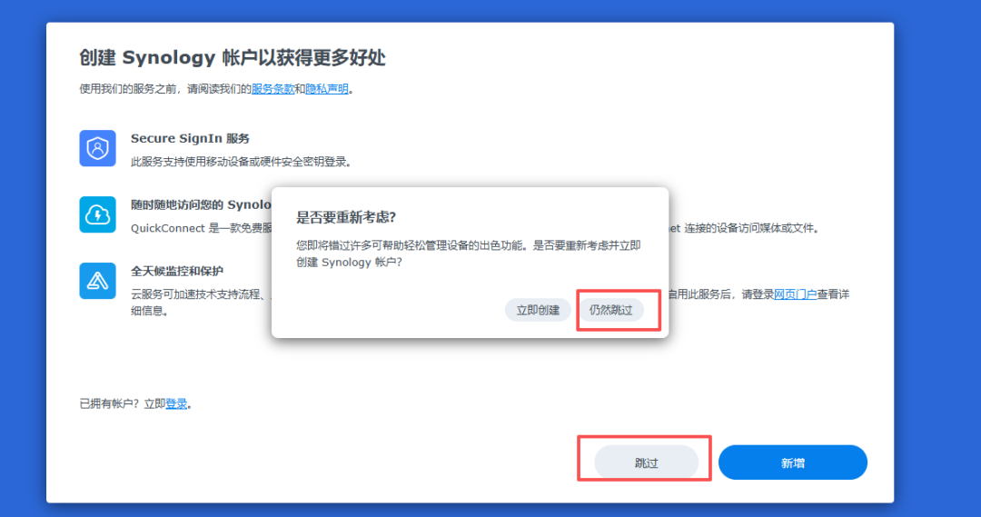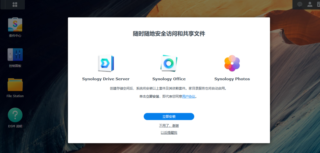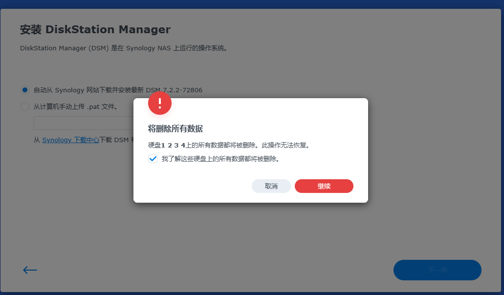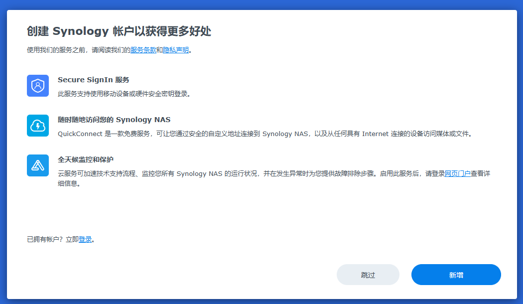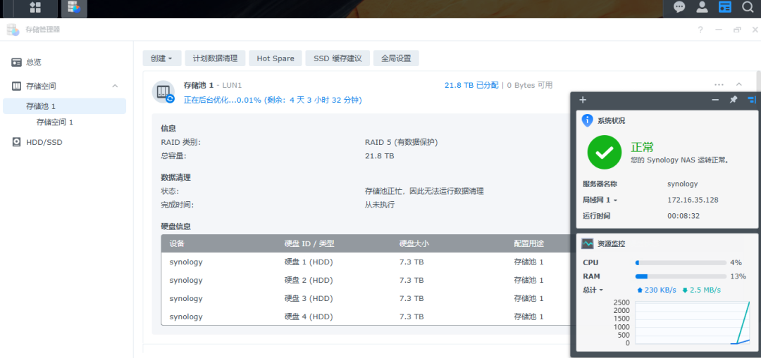 选择windows版本,因为我的电脑操作系统是windows版本。这时需要将NAS连接到公司网络中,最好在同一个局域网。如果不在同一个局域网,或者无法获取ip地址,就容易显示联机失败。将NAS服务器的网口连接到公司的网络中,通过自动获取IP地址。虽说现在NAS还没有操作系统,但是默认NAS的网卡,就是可以通过自动获取IP地址。这时,可以直接双击系统未安装,可以跳出来下面系统安装界面172.16.35.128,安装系统界面,这个系统,是可以通过web网络联网来安装操作系统的。选择从群辉网站上下载并安装最新版本的DNS7.2.2这个版本的操作系统。当出现下面的界面的时候,就说明NAS的操作系统,已经成功安装完成了。系统已经是确定安装完成了,那现在还需要对硬盘进行创建磁盘空间。这时就正在格式化,这个RAID5空间了。这个格式化需要好几个小时才能完成。这时系统和空间都已经格式化成功,这时就可以创建共享文件夹了。