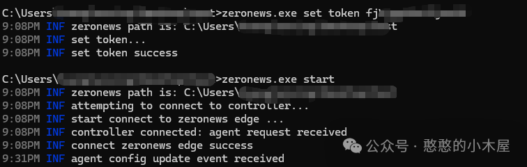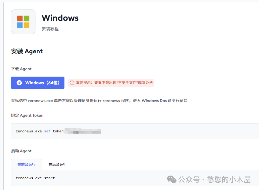 要安装Agent客户端也非常简单,在windows下,只需要前往zeronews.cc下载官方提供的windows Agent客户端,运行并输入“zeronews.exe set token <YOUR_TOKEN>”绑定token,然后再次输入“zeronews.exe start”即可启动。