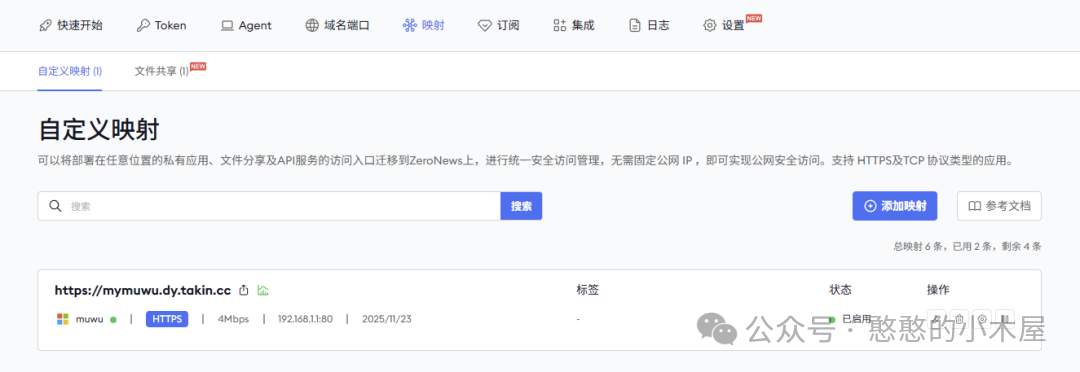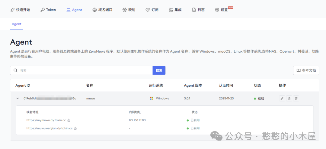 运行好Agent客户端后,就可以在ZeroNews的Web控制台,配置映射,例如我这里Agent绑定了我的电脑,我需要映射内网路由器的web管理界面,那我需要先添加一个自己的域名,官方也提供了自定义子域名,这样也自己不用购买新域名,我这里是需要映射http服务,那域名-协议哪里就选择“https”,如果要映射tcp服务也可以一并加上。最后我们在映射那选择我的电脑,并选择https协议,选择刚刚的域名,输入内网路由器ip以及端口就完成部署。最后打开这个域名就能访问了,就是这么简单,从开始到部署完成,5分钟都不用。