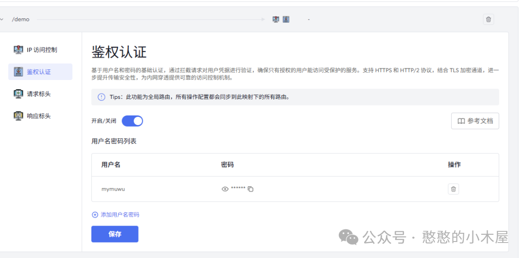 除此之外还可以通过鉴权功能,额外添加一层保护,只有输入正确的用户名以及密码才能访问此服务,极大地提升了内网的安全性。如果有多个不同的映射,分配不同的密码,就可以控制不同人员访问。配合ip访问控制可以实现特定地区+特定用户才能访问,最大限度的保护内网服务安全。