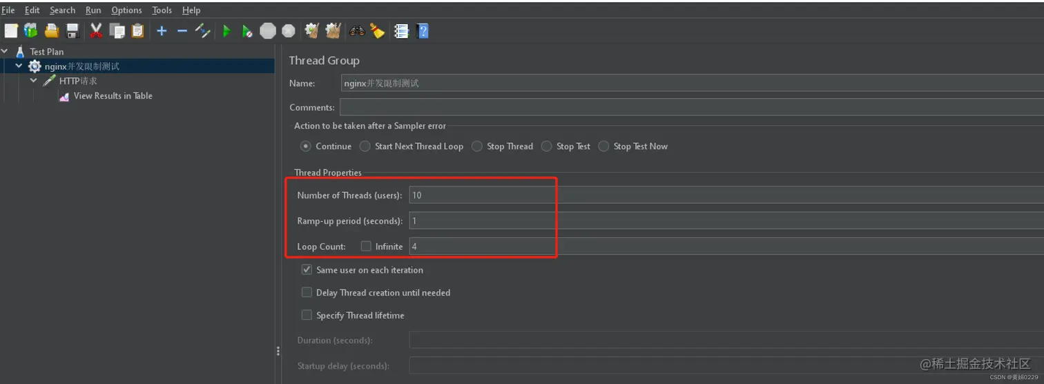 如下图设置并发量为10,循环次数为4