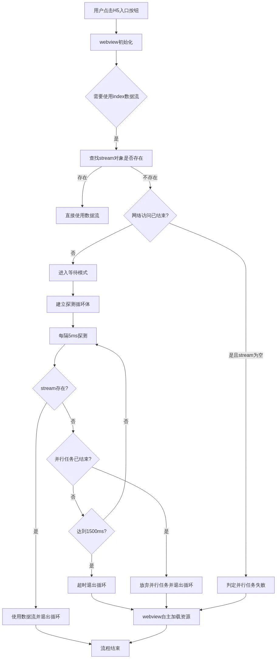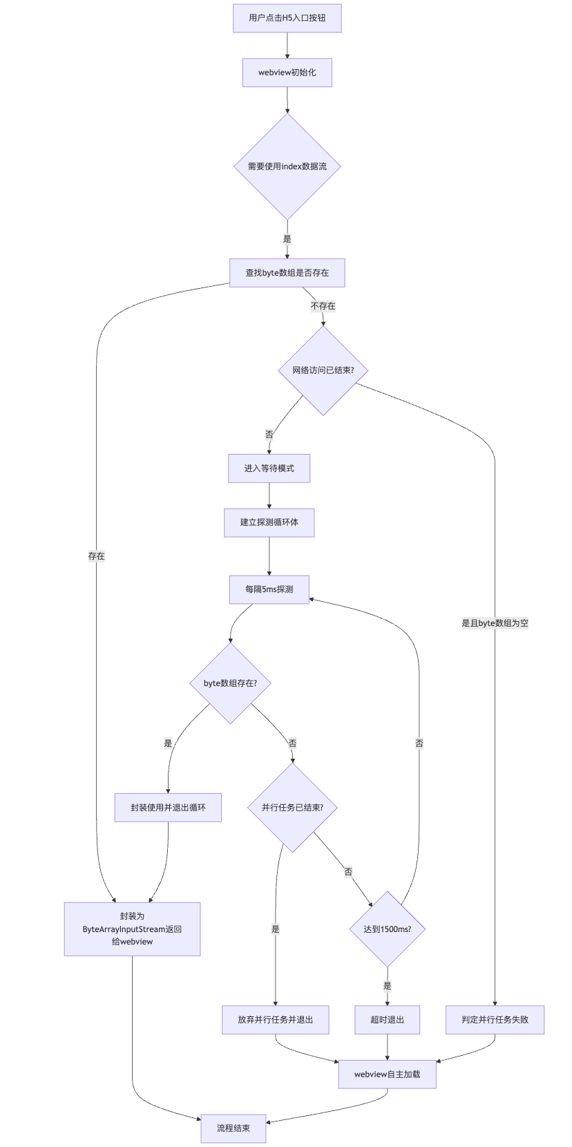 用户点击H5入口按钮,并行index任务发起,访问网络开始建联,一但完成有效建联,则保存网络stream对象,当webview需要使用该数据流的时候,判定stream对象是否存在,如果存在,则直接使用该数据流,如果stream对象不存在,则判定网络访问是否返回,如果是因为网络访问失败导致stream为空,则认为是并行任务失败,否则会进入等待模式,等待模式下,线程建立一个循环体,每隔5ms,探测一次stream是否存在,网络是否已完成建联,一但探测到结果,则退出循环体,即使多次没有探测到结果,1500ms后依然退出循环体,此时放弃并行任务数据,改为webview自主加载资源。