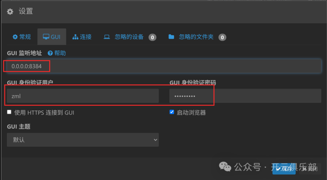找到 <gui> 标签部分,将 <address>127.0.0.1:8384</address> 修改为 0.0.0.0:8384