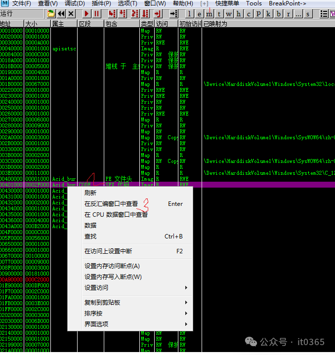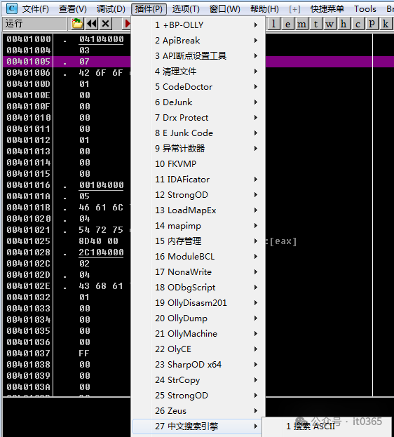 首先点击第1进入内存窗口,在选择第2右键,选择在反汇编窗口中查看,点击功能菜单插件,找到中文搜索