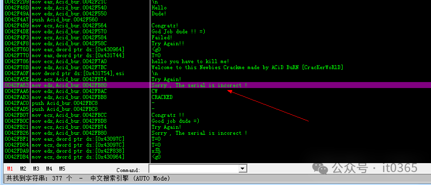 搜索中的字符串,在CTRL+F查找到刚才错误的提示语句,双击查看反汇编代码