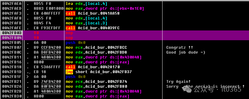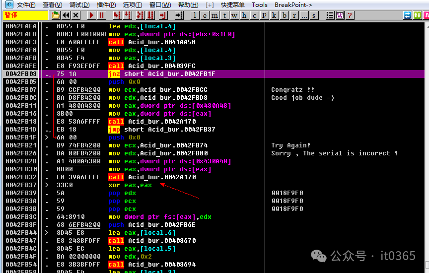 一直往下走,看到红色箭头的就是错误提示框了。上面有个JNZ跳的话就是注册码错误了。如果不让它跳就直接提示注册码正确。