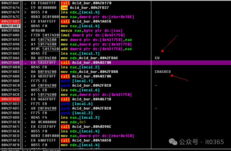0042FA87  |.  8B45 F0       mov eax,[local.4]0042FA8A  |.  0FB600        movzx eax,byte ptr ds:[eax]0042FA8D  |.  F72D 50174300 imul dword ptr ds:[0x431750]0042FA93  |.  A3 50174300   mov dword ptr ds:[0x431750],eax0042FA98  |.  A1 50174300   mov eax,dword ptr ds:[0x431750]0042FA9D  |.  0105 50174300 add dword ptr ds:[0x431750],eax0042FAA3  |.  8D45 FC       lea eax,[local.1]0042FAA6  |.  BA ACFB4200   mov edx,Acid_bur.0042FBAC                ;  CW