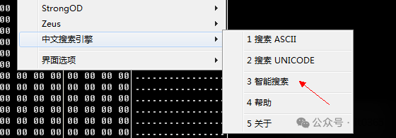 在反汇编窗口右键选择字符串搜索插件进行字符搜索。也可以在菜单上的插件菜单选择进行搜索。