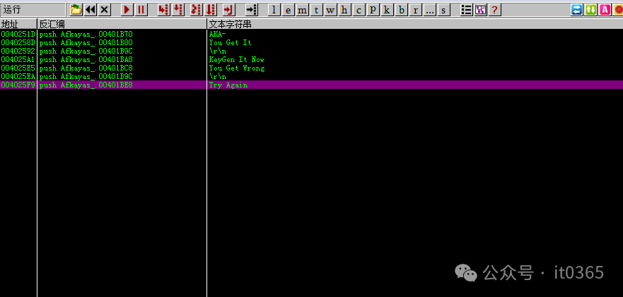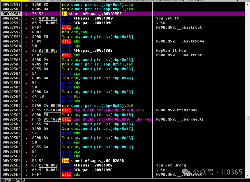 00402409   > \8B95 50FFFFFF mov edx,dword ptr ss:[ebp-0xB0]0040240F   .  8B45 E4       mov eax,dword ptr ss:[ebp-0x1C]00402412   .  50            push eax                                 ; /String = "it0365"00402413   .  8B1A          mov ebx,dword ptr ds:[edx]               ; |00402415   .  FF15 E4404000 call dword ptr ds:[<&MSVBVM50.__vbaLenBs>; \__vbaLenBstr