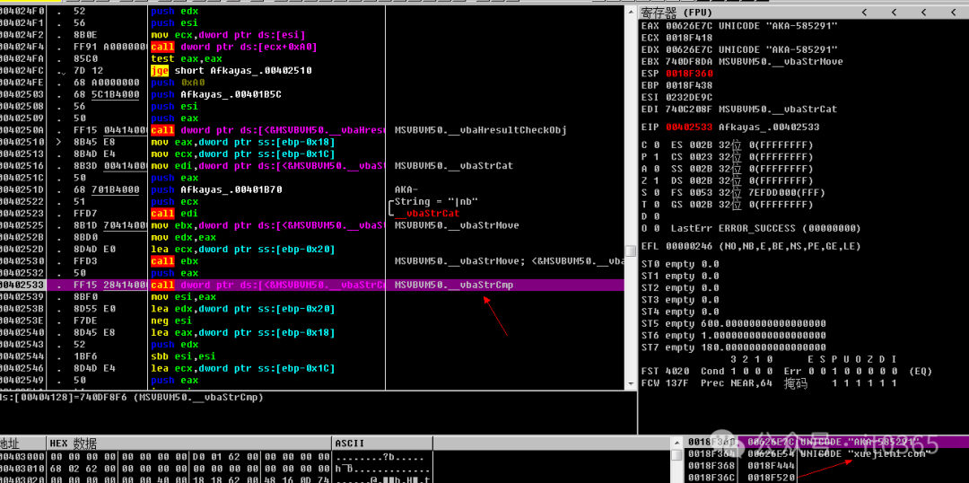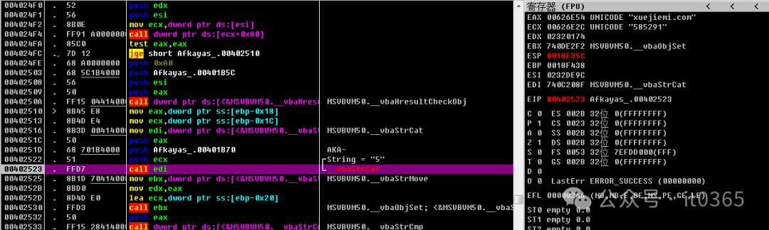 00402510   > \8B45 E8       mov eax,dword ptr ss:[ebp-0x18]00402513   .  8B4D E4       mov ecx,dword ptr ss:[ebp-0x1C]00402516   .  8B3D 00414000 mov edi,dword ptr ds:[<&MSVBVM50.__vbaSt>;  MSVBVM50.__vbaStrCat0040251C   .  50            push eax0040251D   .  68 701B4000   push Afkayas_.00401B70                   ;  AKA-00402522   .  51            push ecx                                 ; /String = "|nb"00402523   .  FFD7          call edi                                 ; \__vbaStrCat