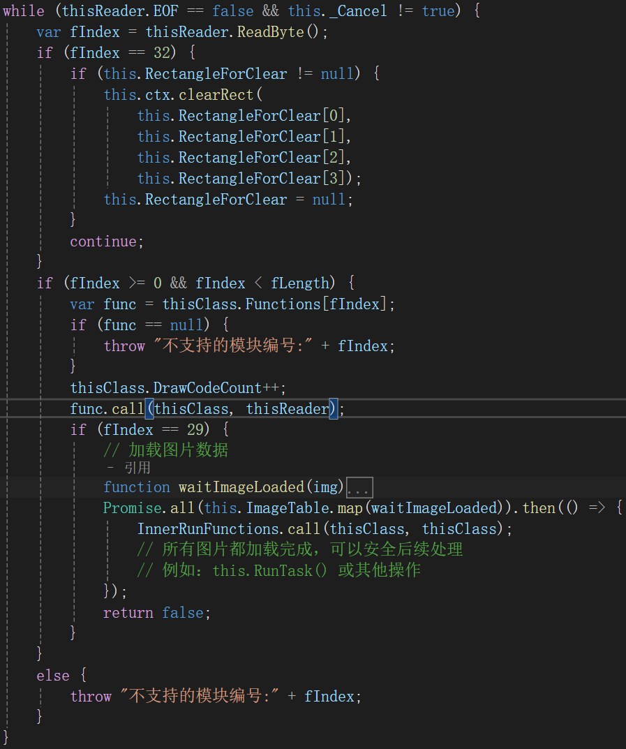 我们定义了一个JS类class PageContentDrawer{}。它获得C#端Graphics对象生成的二进制数组,使用DCBinaryReader封装一下,然后在一个HTML的CANVAS元素上进行绘制。主体代码如图: