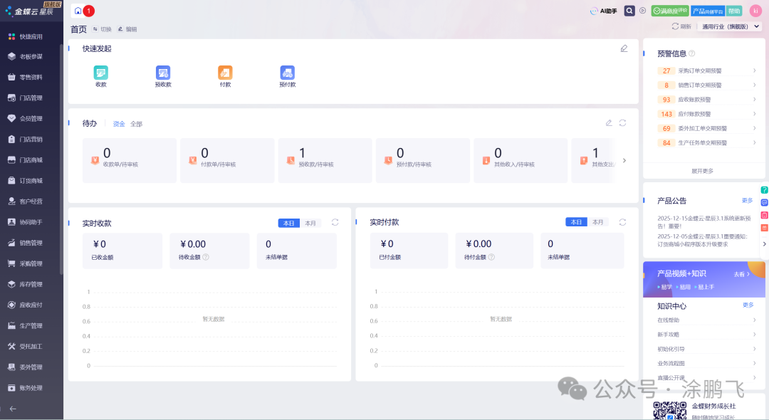 在我之前的文章里面,几乎所有的文章的实操和演示都是基于金蝶云星空企业版进行的,其实在金蝶的生态里面星系列产品有以下几类: 金蝶云星辰:为小微企业、初创公司及成长型企业提供的财务、业务一体化SaaS管理云,这个产品是SaaS产品,是不支持本地部署的,有标准版、专业版、旗舰版,其实各个版本的差距主要在于一些功能和场景使用的差距,就类似于Windows系统的家庭、专业、企业版本一样。 金蝶云星空:金蝶云星空分为企业版和旗舰版,适用于中型企业及以上,其实这两个版本的差距是很大的,底层架构和开发语言都有很大变化,在我之前的一篇文章里面也有一篇很长很长的文章对金蝶云星空的企业版进行了一个全功能的解析与介绍! 【系统】金蝶云星空所有常见功能模块功能介绍与系统截图!6000字深度长文解析! 金蝶云星瀚:这个版本主要是面向大型企业的版本,可以应对各种复杂的业务场景,和高数据量的并发等,是与以前SAP竞争的直接产品。 今天我们主要通过金蝶云星辰的旗舰版来查看其全貌功能。 首页![]()