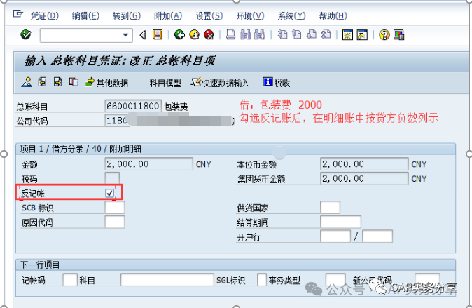 ■业务概述 其实在SAP表结法下,反记账的功能更多只是形式上满足某些观念未转变的会计人员对于科目发生额不虚增的心理预期需求,实务应用中除了耗时耗力并没有产生什么太大的作用,SAP采用表结法,所有科目包括损益类科目都是看科目的期末余额,与国内软件的账结法不同,金蝶用友等国内软件的账结法要求收入增加只能记录贷方,费用增加只能记录在借方,期末月结损益结转时需要将收入费用反向结转至本年利润科目,如果收入在借方或者费用在贷方会导致损益结转不完全,而SAP系统的表结法不需结转损益,表上的科目都是直接设置公式取数,收入费用科目在借方或者贷方都不影响,且在实务中每家公司存在多个经办会计,人员亦存在流动更替,账务处理数量涉及各种业务,要求每个经办会计在每笔账务处理中如果涉及到冲销或者反向分录,为不虚增发生额都做到勾选反记账是一件不可能完全执行到位的事情。 ■反记账 勾选科目行项目反记账功能后,该科目在借贷余明细账中按相反方向的负数列示,主要应用于不虚增当月发生额的手工记账业务中,冲销业务中系统设定的冲销原因码03/04即带有反记账功能,反记账功能只对科目明细账的借贷方向列示产生影响,日常账务处理中的借贷方向不需考虑该影响。 1.勾选行项目反记账
