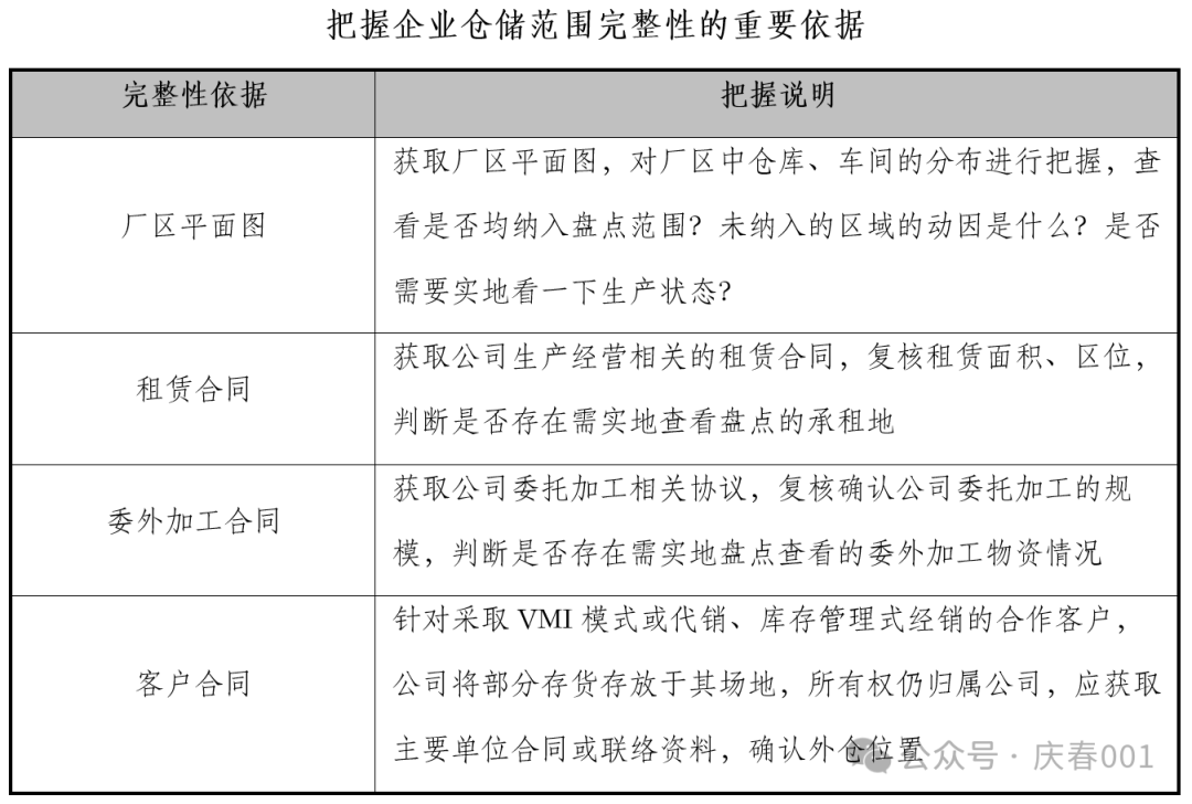 全局观是工作中要树立的重要观念,避免出现挂一漏万的情况。盘点工作是仓库主导、各部门协同、外部审计人员(视节点及情况)参与的一项工作,但不意味着针对现有的安排即全盘接受。针对仓库的安排应该进行检视,避免出现其指哪我们打哪儿,遗漏重要项目或异常管理项目的情况;如公司本身处于存货管理水平较低、管理效能不佳的状态下,应该对盘点安排进行复核,提出有力的意见。 如何对仓储范围完整性进行把握呢?可以将厂区平面图、租赁合同、委外加工合同、客户合同作为重要复核的依据,具体如下表所示: