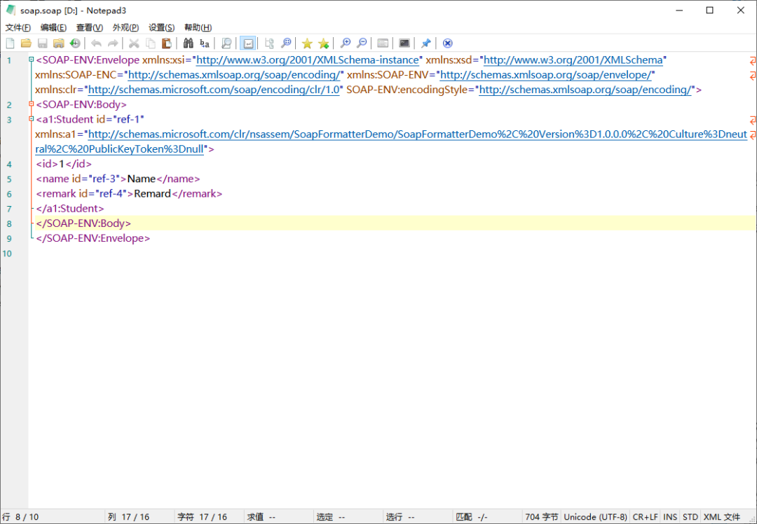 var file = "D:\\soap.soap";Student student = new Student();student.Id = 1;student.Name = "Name";student.Remark = "Remard";SaveAsSOAPFile(student, file);