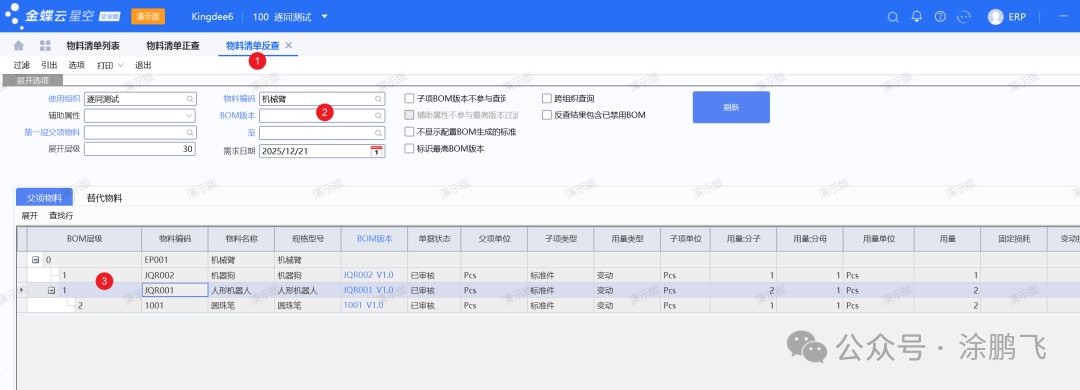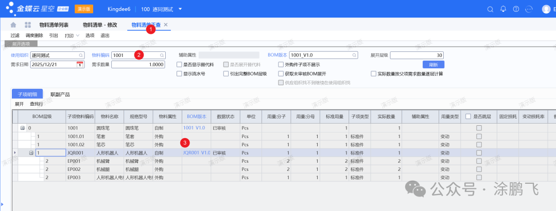1️⃣进入物料清单正查功能。
