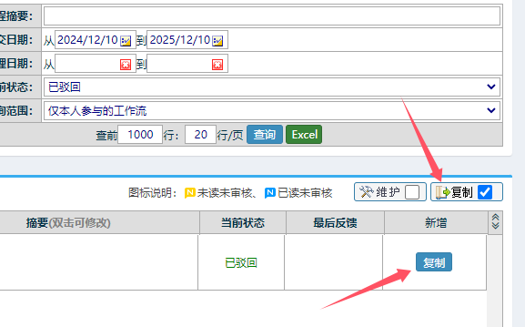 工作流驳回到申请人,能否再原基础上修改后继续提交?在工作流列表页面,勾选右上角“复制”按钮,就会看到有一列新增,后面有一个“复制”按钮,点击就可以在原基础上继续提交了。​
