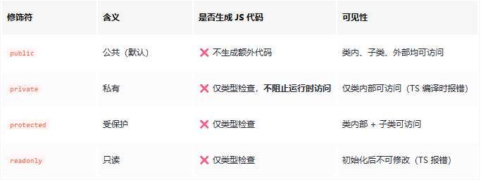 在TypeScript和JavaScript中,类成员变量(属性)的修饰符(Modifiers)用于控制其可见性、可访问性和可变性。两者在能力上有显著差异:TypeScript提供了更丰富的编译时修饰符,而JavaScript(ES2022起)引入了运行时私有字段。