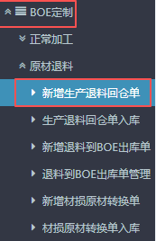 进入ERP系统之后,在左侧功能菜单里找到“BOE定制”,点开“原材退料”,找到“新增退料到BOE出库单”