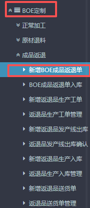 进入ERP系统之后,在左侧功能菜单里点击“BOE定制”,点开“成品返退”,点击“新增BOE成品返退单”。