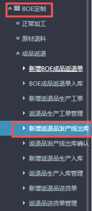 1.进入ERP系统之后,在左侧的功能菜单里找到“BOE定制”,点开“成品返退”,点击“新增返退品发产线出库”。