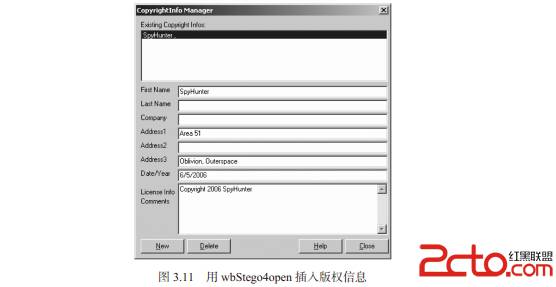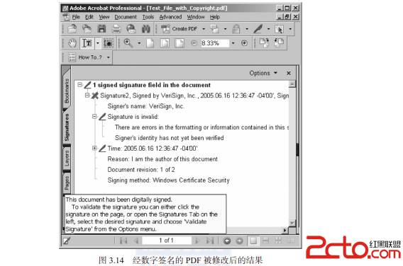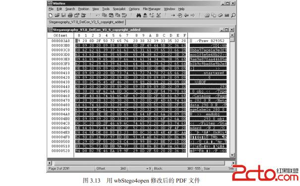 wbStego4open(http://wbstego.wbailer.com )是一个隐写开源工具,它支持Windows和Linux平台。你可以用wbStego4open可以把文件隐藏到BMP、TXT、HTM和PDF文件中,且不会被看出破绽。还可以用它来创建版权标识文件并嵌入到文件中将其隐藏。能够允许用户把数据隐藏到PDF文件中的隐写程序非常少,我们打开wbStego4open这个隐写程序,研究下PDF文件吧(如图3.10所示)。 这个程序利用PDF文件头添加额外信息,这个区域的信息会被Adobe Acrobat Reader阅读器(如图3.11所示)忽略。此外,wbStego在插入数据时(此处以非加密的版权信息为例),充分利用了插入法和LSB修改法两种技术。 首先,wbStego4open会把插入数据中的每一个ASCII码转换为二进制形式,然后把每一个二进制数字再替换为十六进制的20或者09,20代表0,09代表1。例如,在wbStego4open的版权管理器(Copyright Manager)中,输入一个包含“Oblivion”的地址,wbStego4open就会将其由ASCII码转换成相应的二进制码,然后再用0x20和0x09替换每个二进制数(如图3.12所示)。 最后,这些转换后的十六进制数据被嵌入到PDF文件中。查看用wbStego4open修改后的文件内容,会发现文件中已混入了很多由20和09组成的8位字节(如图3.13所示)。 把这些8位字节取出来后,再提取其最低有效位,组合后即可获得其所代表的ASCII码的二进制形式,然后再把二进制码转换成ASCII码就能得到原始消息了。 wbStego4open确实支持很多其他隐写程序不支持的文件类型,比如本例中的PDF文件。实际上,前面的例子中的Adobe PDF文件是有密码保护的。注意,虽然该文件是有密码保护的,我们还是成功地修改了这个文件。这算不上是一种脆弱性,但确实说明PDF的安全保护能力有待提高,比如,为PDF文件进行数字签名,就可以让接收者知道文件已经被修改过了。密码保护主要用来防止打印或者复制Adobe PDF文件的内容,而数字证书则可以防止文件内容被篡改。拥有数字证书的PDF文件内容其实是可以修改的,但会提示接收者文件已经被修改过了,不要相信其中的内容(参见图3.14)。