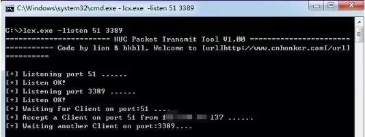 例如:Lcx.exe –listen 51 3389
