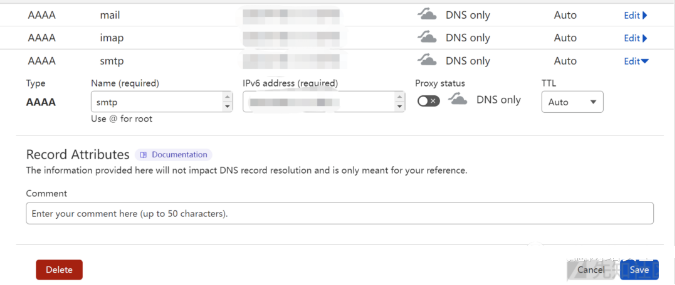 将 mail.mydomain.com 的 AAAA 记录指向你的 VPS 服务器(邮件服务器)IPv6地址
