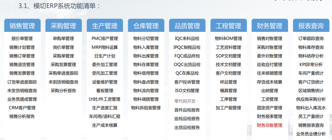 点晴模切ERP专为模切企业提供一整套的信息化解决方案,注重模切企业人、才、物的一体化管理。功能包括销售管理、采购管理、 生产管理(MRP/排产/制程管控)、仓库管理(原辅料/成品/ 刀模)、工程管理( BOM/工艺/样品)、品质管理、财务管理 (对账/存货核算/总账)等,并支持手机/手持终端实时在线操作,从而提高企业员工在各个环境的效率和降低出错。