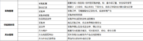 1. 本次对比仅根据主流厂商(学习的厂商)的宣传资料和操作手册进行对比,本文不做额外的延伸和扩展,如有描述不准确的地方,欢迎同行指正。2. 本次对比的主流厂商包括,富勒(截止2022年4月)、唯智(截止2020年2月)、运匠(截止2023年3月)、物联云仓(截止2022年10月)的WMS系统(SaaS)。富勒:业务系统管理(用户、仓库);基础设置(包装、货类、装箱、海关、客户、产品、组件);仓库设置(区域、库区、库位组、工作区、库位、路线、月台、设备、输送线、堆垛机、播种墙、员工、设施)唯智:包括组织(货主、收货人、承运商、单据类型,用户);仓库(仓库、库区、库位、工作区、月台);货品(货品)运匠:包括参与者(机构、货主、客户、经销商、供应商、承运商、司机、联系人、员工);商品(商品、商品分类、商品包装、商品BOM、包材、容器);仓库(仓库、月台、巷道、库区、库位、库房、播种墙、集合口、捆包台、工作区域、容器规格组、仓库设备)物联:包括企业级(货主、货品、仓库、店铺、承运商)、仓库级-仓库设置(区域、库区、货位、播种墙、耗材)补充:物联系统分为企业级和仓库级,企业级主要进行多仓统一管理和主数据管理,而仓库级更专注于单仓业务处理和相关配置。具体要求:提供货物买卖双方之间的协议记录,并作为预期到货通知的信息来源,可按采购订单进行预约月台管理富勒:支持供应商采购预约,可按月台预约进行管理,并支持附件维护。预约后车辆到达园区,支持入园登记,园区管理运匠:供应商可采购单可生成送货单,提供到货预约,打印采购送货单,发货后生成到货通知单。不支持提前预约的月台管理1、收货、质检、上架流程完善,支持先质检后收货,动态设置多场景收货策略。2、支持PDA设备执行入库操作,根据货物上架策略获取目标库位,由人工/AGV将货物运送至指定位置,扫描库位标签绑定完成入库操作1、支持通过到货通知单进行卸货、质检验收、点货贴标、收货后生成上架任务,按上架任务进行上架作业;2、可配置的流程和规则,若允许超收设置允许超额收货的比率。唯智:支持ASN单一商品收货和整单收货、根据收货的情况,创建上架作业单。对完成收货的ASN单允许质检登记。不支持先质检再收货1、支持通过到货通知单进行卸货和收货(根据收货验证规则进行校验)2、可生成预收货单,并可按收货品检记录质检品检情况进行收货3、可按不同场景和条件根据规则(批次规则、混放规则、上架规则)生成上架任务,全程支持PDA设备进行作业2、 质检不是收货主流程,且PDA操作不支持质检登记1.wms仓储物流管理系统定期自动保存库存快照及实时变化情况,以备核查。详细、精确统计人员作业情况,为绩效考核和任务量调整提供数据支撑。2.提供近效期预警、低周转预警、单据超时预警、紧急任务卡顿预警、库存上下限阀值预警。1、 支持库存余量、库存冻结、库存转移、库存调整、库存移动2、 支持ABC动态分析、库存对账、图形化库存2D,3D1、 支持标准库存查询、历史库存日志、库存快照管理。库内调整(按货主、货品、属性、状态)1、按业务库存、实物库存、在途库存。多层库存进行管理2、支持移位、补货、理货、外借排查、库存调整、效期管理、库存转移5、根据上(主库位、线边库位)下限补货、出库订单缺货计算出缺货记录,以提供库存预警1、支持库存移动、库存转移、货权转移、库存调整、库存冻结解冻、补货、序列号库存调整2、报表管理支持库存预警查看、临到期(效期)报表查看1、拣货、打包、装箱流程完善,wms仓储物流管理系统下发出库任务,无人车间管理服务根据出库任务下发AGV调度指令,AGV根据指定线路前往指定库位,获取货物送往指定出库区。2、配合PDA设备扫描审核,出现错误时,会发出警报,让库管人员及时处理,最后把数据发送到系统中更新数据库完成出库。1、可对发货进度进行全程跟踪(创建、分配、拣货、装箱、发运、关闭、取消)2、不同发货级别控制(按波次、按订单、按订单行、按跟踪号、按装车单)4、支持不同的拣货模式(订单拣货、接力拣货、提前拣选、播种模式、二次摘果等)1、支持装车、拣选(按区拣选、整箱、零散)、包装等作业场景2、支持动态分配拣选、按单/按托复核、集货捆包、出库交接提供越库规则,通过越库标记进行越库处理,支持机会性越库1、可配置商品库位/库区所需要参与越库的数量,用于无出库单的提前越库2、通过越库规则将出入库单自动关联越库的条件,进行越库处理3、支持到货通知单选择出库订单建立越库关系(转运)可通过流程配置(订单类型)进行越库处理,越库功能较为薄弱2、实现全局库存可视化、精益化、高效率的业务管理模式1、通过全局参数配置、仓库参数配置、货主参数配置、商品参数配置、商品分类参数配置、层层配置来实现2、可配置包材、商品库位、商品质检、商品越库、冬季出库捆包、独立捆包包材、中心仓库存、仓库库存读、库存频度、SN管理作业点配置5、页面主题配置、系统主题配置、客户端登录、登录时长配置、导入导出配置打印模板配置(FastReport)、仓库配置、效期配置、库存分配设置(仓储区、拣选区)、订单取消设置、定时任务设置、消息通知设置、客户端视频配置上架规则、库存周转规则、预配规则、分配规则、波次计划规则、质检规则、