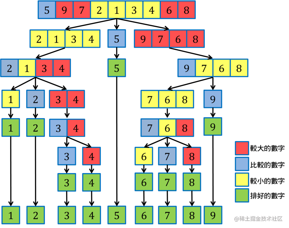 通过选定一个数字作为比较值,将要排序其他数字,分为 >比较值 和 <比较值,两个部分。并不断重复这个步骤,直到只剩要排序的数字只有本身,则排序完成。
