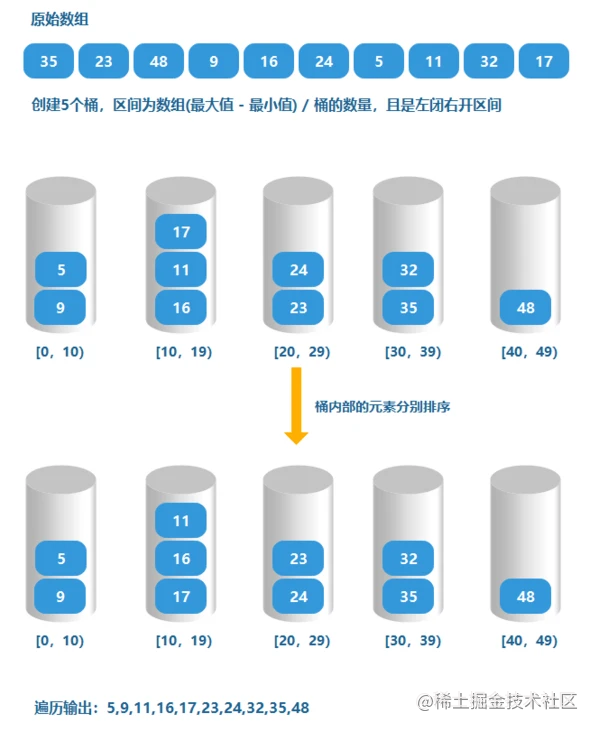 20. buckets[bucketIndex].push(arr[k]); // 排序的数字放入对应桶中