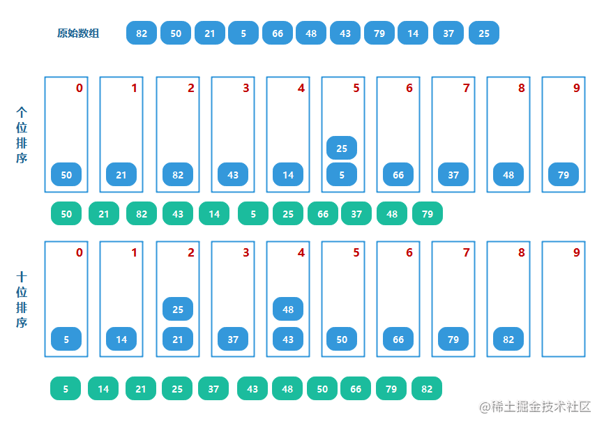 从低位开始比较,逐位进行比较,让每个进制位(个、十、百、千、万)上的数字,都能放入对应的桶中,形成局部有序。
