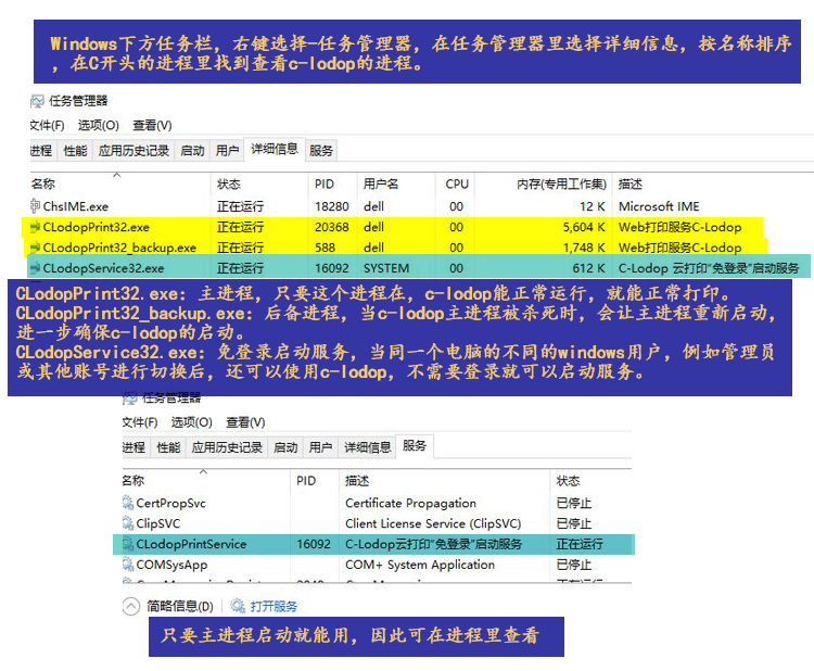在windows任务管理器里,最新版可以看到有三个进程,例如安32位c-lodop的时候,有CLodopPrint32.exe、CLodopPrint32_backup.exe、CLodopService32.exe。