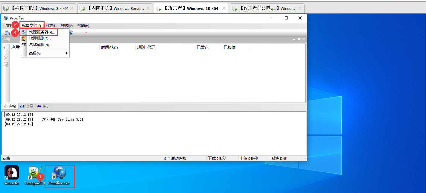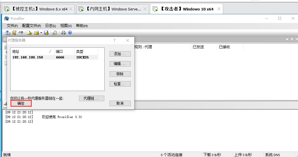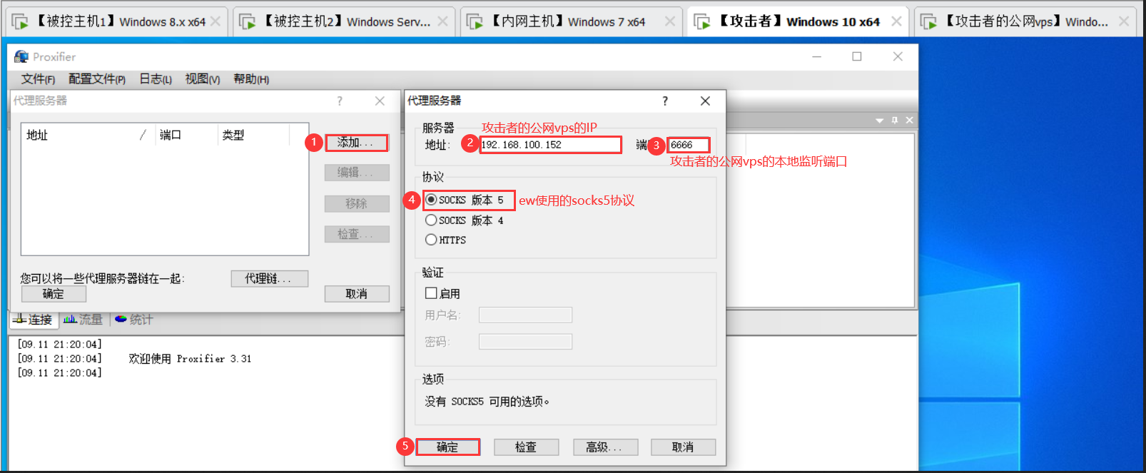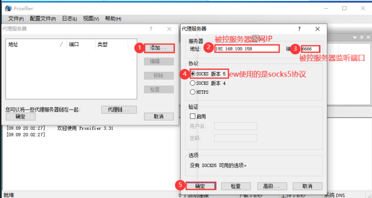 4、使用proxifier代理工具客户端连接公网vps上ew(Earthworm)的监听的端口: