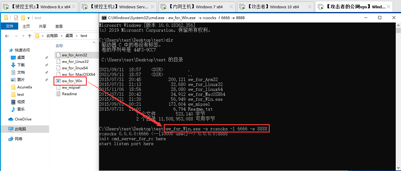 1.4 实验过程:1、在攻击者的公网vps上添加转接隧道,将6666收到的代理请求转交给反连8888端口的被控服务器: ew_for_Win.exe -s rcsocks -l 6666 -e 8888 -s 指定工作模式 rcsocks 反向socks代理客户端 -l listenport在代理客户端设置监听端口,将6666收到的 代理请求 转交给反连8888端口的被控服务器。 -e refport设置反弹端口,用于接收被控服务器反弹过来的代理流量。