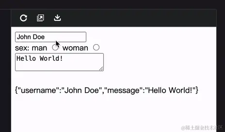 您可以跳转到 状态同步案例 以查看效果。 最简单的表单操作表单只需调用formData方法,就能生成自动同步数据的对象: <form id="myForm"> <input type="text" name="username" value="John Doe" /> <div> sex: <label> man <input type="radio" name="sex" value="man" /> </label> <label> woman <input type radio="radio" name="sex" value="woman" /> </label> </div> <textarea name="message">Hello World!</textarea> </form> <br /> <div id="logger"></div> <script> const data = $("#myForm").formData(); $("#logger").text = data; data.watch(() => { $("#logger").text = data; }); </script>