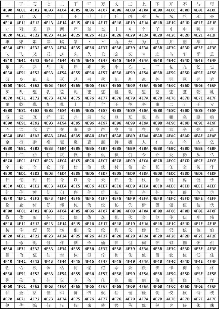 6. 【02B0-02EF】 Spacing Modifier Letters 进格修饰字符 7. 【0300-036F】 Combining Diacritical Marks 组合音标附加符号 8. 【0370-03FF】 Greek and Coptic 希腊字母 9. 【0400-04FF】 Cyrillic 西里尔字母 10. 【0500-052F】 Cyrillic Supplement 西里尔字母补充 11. 【0530-058F】 Armenian 亚美尼亚文 12. 【0590-05FF】 Hebrew 希伯来文 13. 【0600-06FF】 Arabic 基本阿拉伯文 14. 【0700-074F】 Syriac 叙利亚文 15. 【0750-077F】 Arabic Supplement 阿拉伯文补充 16. 【0780-07BF】 Thaana 塔纳文 17. 【07C0-07FF】 N'Ko 18. 【0900-097F】 Devanagari 天城体梵文字母 19. 【0980-09FF】 Bengali 孟加拉国文 20. 【0A00-0A7F】 Gurmukhi 古尔穆基文 21. 【0A80-0AFF】 Gujarati 古吉拉特文 22. 【0B00-0B7F】 Oriya 奥里亚文 23. 【0B80-0BFF】 Tamil 泰米尔文 24. 【0C00-0C7F】 Telugu 泰卢固文 25. 【0C80-0CFF】 Kannada 卡纳达文 26. 【0D00-0D7F】 Malayalam 马拉亚拉姆文 27. 【0D80-0DFF】 Sinhala 僧伽罗文 28. 【0E00-0E7F】 Thai 泰文 29. 【0E80-0EFF】 Lao 老挝文;寮国文 30. 【0F00-0FFF】 Tibetan 藏文 31. 【1000-109F】 Myanmar 缅甸文 32. 【10A0-10FF】 Georgian 格鲁吉亚文 33. 【1100-11FF】 Hangul Jamo 谚文字母 34. 【1200-137F】 Ethiopic 埃塞俄比亚文 35. 【1380-139F】 Ethiopic Supplement 埃塞俄比亚文补充 36. 【13A0-13FF】 Cherokee 切罗基文 37. 【1400-167F】 Unified Canadian Aboriginal Syllabics 加拿大土著统一音节文字 38. 【1680-169F】 Ogham 欧甘文 39. 【16A0-16FF】 Runic 北欧古文 40. 【1700-171F】 Tagalog 他加禄文 41. 【1720-173F】 Hanunoo 哈努诺文 42. 【1740-175F】 Buhid 布什德文 43. 【1760-177F】 Tagbanwa 塔格巴努亚文 44. 【1780-17FF】 Khmer 高棉文 45. 【1800-18AF】 Mongolian 蒙古文 46. 【1900-194F】 Limbu 林布文 47. 【1950-197F】 Tai Le 傣哪文;德宏傣文 48. 【1980-19DF】 New Tai Lue 新傣仂文 49. 【19E0-19FF】 Khmer Symbols 高棉符号 50. 【1A00-1A1F】 Buginese 布吉文 51. 【1B00-1B7F】 Balinese 巴利文 52. 【1D00-1D7F】 Phonetic Extensions 音标扩充 53. 【1D80-1DBF】 Phonetic Extensions Supplement 音标扩充补充 54. 【1DC0-1DFF】 Combining Diacritical Marks Supplement 组合音标附加符号 55. 【1E00-1EFF】 Latin Extended Additional 拉丁字母扩充附加 56. 【1F00-1FFF】 Greek Extended 希腊文扩充 57. 【2000-206F】 General Punctuation 一般标点符号 58. 【2070-209F】 Superscripts and Subscripts 下标及上标 59. 【20A0-20CF】 Currency Symbols 货币符号 60. 【20D0-20FF】 Combining Diacritical Marks for Symbols 符号用组合附加符号 61. 【2100-214F】 Letterlike Symbols 似字母符号 62. 【2150-218F】 Number Forms 数字形式 63. 【2190-21FF】 Arrows 箭头符号 64. 【2200-22FF】 Mathematical Operators 数学运算符号 65. 【2300-23FF】 Miscellaneous Technical 混合专门符号 66. 【2400-243F】 Control Pictures 控制图像 67. 【2440-245F】 Optical Character Recognition 光学字符识别 68. 【2460-24FF】 Enclosed Alphanumerics 括号字母数字 69. 【2500-257F】 Box Drawing 制表符 70. 【2580-259F】 Block Elements 区块组件 71. 【25A0-25FF】 Geometric Shapes 几何形状 72. 【2600-26FF】 Miscellaneous Symbols 混合什锦符号 73. 【2700-27BF】 Dingbats 什锦符号 74. 【27C0-27EF】 Miscellaneous Mathematical Symbols-A 混合数学符号-A 75. 【27F0-27FF】 Supplemental Arrows-A 补充性箭头符号-A 76. 【2800-28FF】 Braille Patterns 盲文;盲人点字 77. 【2900-297F】 Supplemental Arrows-B 补充性箭头符号-B 78. 【2980-29FF】 Miscellaneous Mathematical Symbols-B 混合数学符号-B 79. 【2A00-2AFF】 Supplemental Mathematical Operators 补充性数学运算符号 80. 【2B00-2BFF】 Miscellaneous Symbols and Arrows 混合什锦符号和箭头符号 81. 【2C00-2C5F】 Glagolitic 格拉戈尔字母 82. 【2C60-2C7F】 Latin Extended-C 拉丁字母扩充-C 83. 【2C80-2CFF】 Coptic 科普特文 84. 【2D00-2D2F】 Georgian Supplement 格鲁吉亚文补充 85. 【2D30-2D7F】 Tifinagh 提非纳格字母 86. 【2D80-2DDF】 Ethiopic Extended 埃塞俄比亚文扩充 87. 【2E00-2E7F】 Supplemental Punctuation 补充性标点符号 88. 【2E80-2EFF】 CJK Radicals Supplement 中日韩部首补充 89. 【2F00-2FDF】 Kangxi Radicals 康熙部首 90. 【2FF0-2FFF】 Ideographic Description Characters 汉字结构描述字符 91. 【3000-303F】 CJK Symbols and Punctuation 中日韩符号和标点 92. 【3040-309F】 Hiragana 平假名 93. 【30A0-30FF】 Katakana 片假名 94. 【3100-312F】 Bopomofo 注音符号 95. 【3130-318F】 Hangul Compatibility Jamo 谚文兼容字母 96. 【3190-319F】 Kanbun 汉文标注号 97. 【31A0-31BF】 Bopomofo Extended 注音符号扩充 98. 【31C0-31EF】 CJK Strokes 中日韩笔画部件 99. 【31F0-31FF】 Katakana Phonetic Extensions 片假名音标扩充 100.【3200-32FF】 Enclosed CJK Letters and Months 中日韩括号字母及月份 101.【3300-33FF】 CJK Compatibility 中日韩兼容字符 102.【3400-4DBF】 CJK Unified Ideographs Extension A 中日韩统一表意文字扩充A 103.【4DC0-4DFF】 Yijing Hexagram Symbols 易经六十四卦象 104.【4E00-9FFF】 CJK Unified Ideographs 中日韩统一表意文字 105.【A000-A48F】 Yi Syllables 彝文音节 106.【A490-A4CF】 Yi Radicals 彝文字母 107.【A700-A71F】 Modifier Tone Letters 声调符号 108.【A720-A7FF】 Latin Extended-D 拉丁字母扩充-D 109.【A800-A82F】 Syloti Nagri 110.【A840-A87F】 Phags-pa 八思巴字母 111.【AC00-D7AF】 Hangul Syllables 谚文音节 112.【D800-DB7F】 High Surrogates 高半代用区 113.【DB80-DBFF】 High Private Use Surrogates 高半专用代用区 114.【DC00-DFFF】 Low Surrogates 低半代用区 115.【E000-F8FF】 Private Use Area 专用区 116.【F900-FAFF】 CJK Compatibility Ideographs 中日韩兼容表意文字 117.【FB00-FB4F】 Alphabetic Presentation Forms 字母变