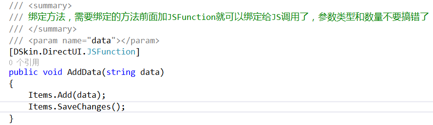 页面设置一个绑定的全局ID,默认是page,如果想改成其他的,页面和C#类需要一起改,在构造函数里设置。这个ID和Vue绑定ID是一致的! 页面里的 {{Text}} 就是绑定到C#里定义的Text的属性了 绑定操作写好之后,Js中就可以操作这个Vue绑定对象了,对象名就是那个Id,默认为page Js中的高级操作可以到Vue官网查看教程 https://cn.vuejs.org/v2/guide/ 比如Js中调用 page.Text=’这么牛逼!’; 这个值就会更新到C#类Text属性和页面 Js绑定C#方法,方法上面加JSFunction,方法参数只支持简单的数据类型,数量和类型要和JS调用的对应