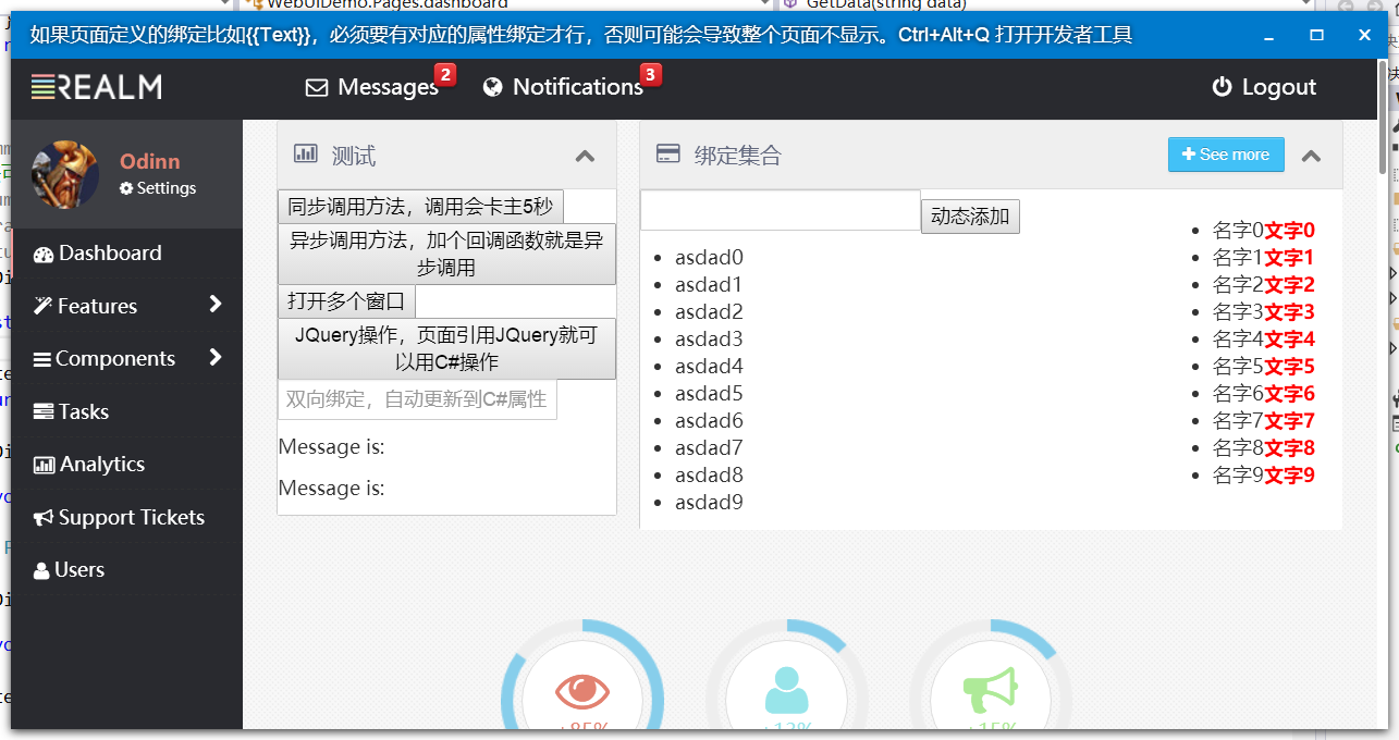 C#属性和页面双向绑定,依赖Vue,支持简单属性的双向绑定,和集合的单向绑定,复杂属性请用Json字符串 JS中也可以用Get(“属性名”); Set(“属性名”,值) 访问和设置属性值,可以不需要Vue