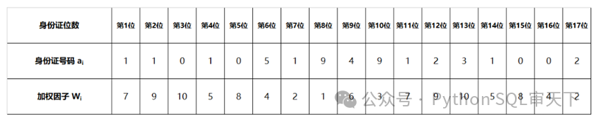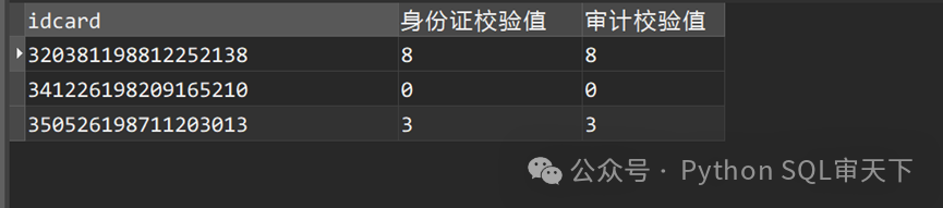 具体测试SQL语句如下: WITH xx AS( SELECT idcard,( SUBSTRING(idcard,1,1)*7 + SUBSTRING(idcard,2,1)*9 + SUBSTRING(idcard,3,1)*10 + SUBSTRING(idcard,4,1)*5 + SUBSTRING(idcard,5,1)*8 + SUBSTRING(idcard,6,1)*4 + SUBSTRING(idcard,7,1)*2 + SUBSTRING(idcard,8,1)*1 + SUBSTRING(idcard,9,1)*6 + SUBSTRING(idcard,10,1)*3 + SUBSTRING(idcard,11,1)*7 + SUBSTRING(idcard,12,1)*9 + SUBSTRING(idcard,13,1)*10 + SUBSTRING(idcard,14,1)*5 + SUBSTRING(idcard,15,1)*8 + SUBSTRING(idcard,16,1)*4 + SUBSTRING(idcard,17,1)*2) % 11 AS '校验和模值' FROM tongji) SELECT idcard, RIGHT(idcard,1) AS '身份证校验值', CASE WHEN 校验和模值 = 0 THEN '1' WHEN 校验和模值 = 1 THEN '0' WHEN 校验和模值 = 2 THEN 'X' WHEN 校验和模值 = 3 THEN '9' WHEN 校验和模值 = 4 THEN '8' WHEN 校验和模值 = 5 THEN '7' WHEN 校验和模值 = 6 THEN '6' WHEN 校验和模值 = 7 THEN '5' WHEN 校验和模值 = 8 THEN '4' WHEN 校验和模值 = 9 THEN '3' WHEN 校验和模值 = 10 THEN '2' ELSE '其他' END AS '审计校验值' FROM xx; 测试结果:
