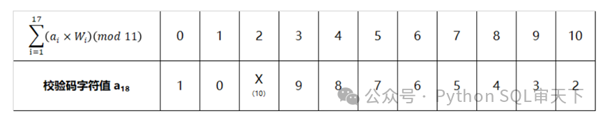 (3)将乘积之和取模 11(即除以 11 取余数),然后根据下表得到对应的第 18 位校验码