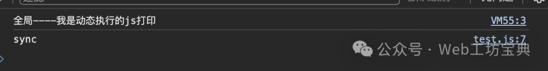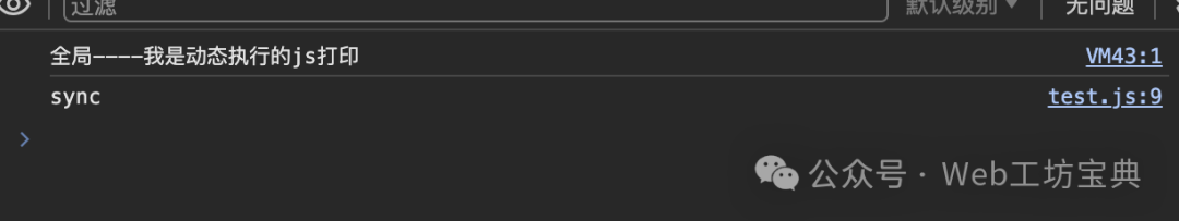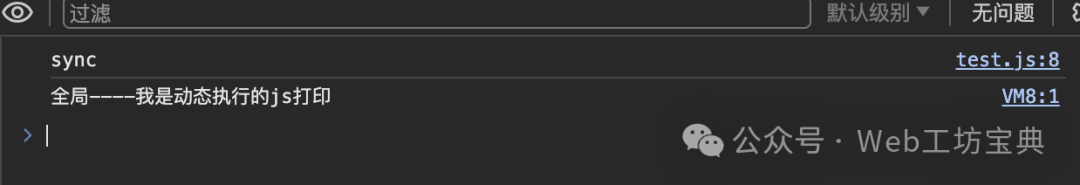 3、创建 script 标签,添加到页面 特点:会产生一个 script 元素;同步;作用域是全局作用域,不受当前作用域影响。 var log = '全局----我是动态执行的js打印'; function exec (code) { var log = '局部----log我是动态执行的js打印'; const script = document.createElement("script"); script.innerHTML = code; document.head.appendChild(script); } exec("console.log(log)"); console.log('sync');
