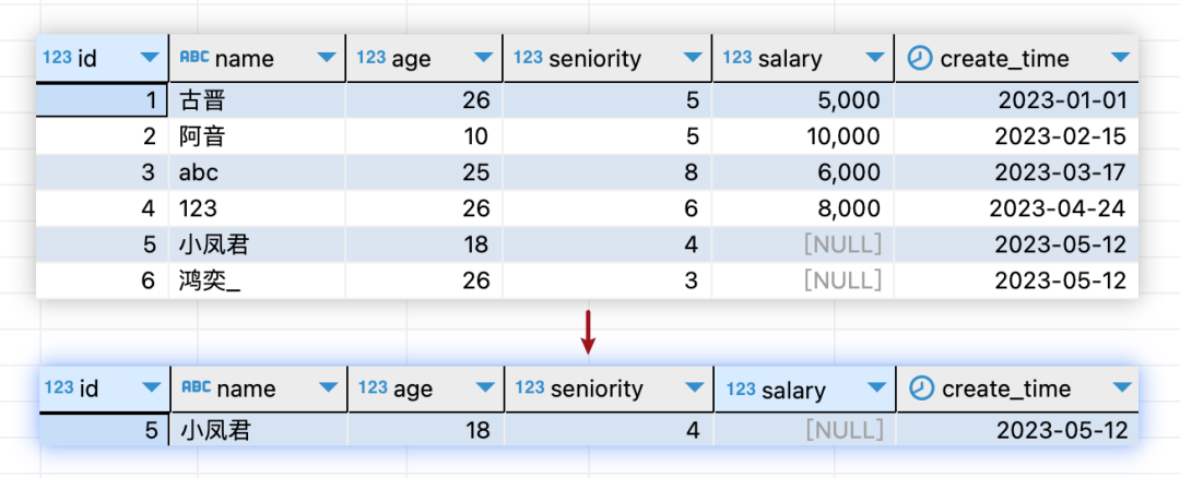可以看到,要查询名字中包含特定字(例如"凤")的员工,当我们使用 REGEXP 时,不需加任何匹配规则,只需用单引号或双引号来包围字符即可,相当于LIKE '%%',注意,REGEXP 中没有LIKE的%和_通配符。 查询结果如下: