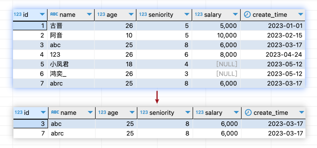 默认情况下,REGEXP是不区分大小写的。查询结果跟上图一致,返回abc、abrc的记录。 如果我们想找到所有名字中包含"古"或"音"的员工,可以使用以下SQL语句: