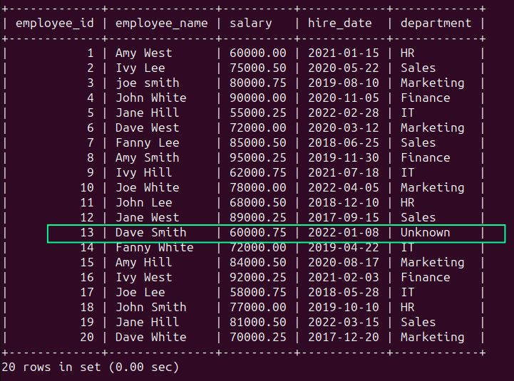 -- 插入20个样本记录 INSERT INTO employees (employee_id, employee_name, salary, hire_date, department) VALUES (1 , 'Amy West' , 60000.00 , '2021-01-15' , 'HR' ), (2 , 'Ivy Lee' , 75000.50 , '2020-05-22' , 'Sales' ), (3 , 'joe smith' , 80000.75 , '2019-08-10' , 'Marketing' ), (4 , 'John White' , 90000.00 , '2020-11-05' , 'Finance' ), (5 , 'Jane Hill' , 55000.25 , '2022-02-28' , 'IT' ), (6 , 'Dave West' , 72000.00 , '2020-03-12' , 'Marketing' ), (7 , 'Fanny Lee' , 85000.50 , '2018-06-25' , 'Sales' ), (8 , 'Amy Smith' , 95000.25 , '2019-11-30' , 'Finance' ), (9 , 'Ivy Hill' , 62000.75 , '2021-07-18' , 'IT' ), (10 , 'Joe White' , 78000.00 , '2022-04-05' , 'Marketing' ), (11 , 'John Lee' , 68000.50 , '2018-12-10' , 'HR' ), (12 , 'Jane West' , 89000.25 , '2017-09-15' , 'Sales' ), (13 , 'Dave Smith' , 60000.75 , '2022-01-08' , NULL ), (14 , 'Fanny White' , 72000.00 , '2019-04-22' , 'IT' ), (15 , 'Amy Hill' , 84000.50 , '2020-08-17' , 'Marketing' ), (16 , 'Ivy West' , 92000.25 , '2021-02-03' , 'Finance' ), (17 , 'Joe Lee' , 58000.75 , '2018-05-28' , 'IT' ), (18 , 'John Smith' , 77000.00 , '2019-10-10' , 'HR' ), (19 , 'Jane Hill' , 81000.50 , '2022-03-15' , 'Sales' ), (20 , 'Dave White' , 70000.25 , '2017-12-20' , 'Marketing' );如果你能注意到的话,在这里使用了一小部分名字和姓氏作为样本,并为记录构建了姓名字段。不过,你也可以对记录进行更有创意的处理。